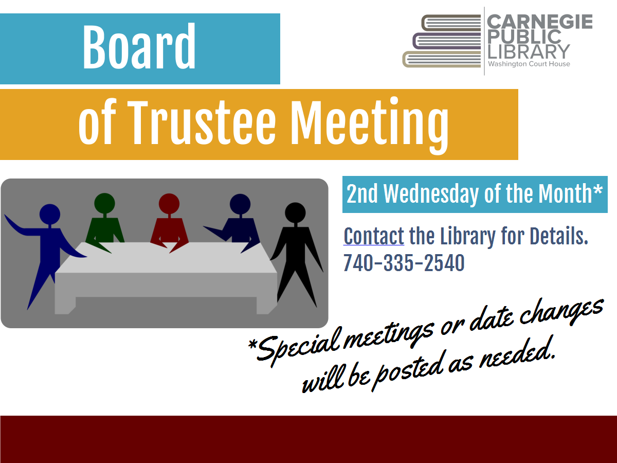 LabelInformation Dates & times Wed, 04/08/2026 - 5:30pm -Wed, 04/08/2026 - 6:30pm Wed, 05/13/2026 - 5:30pm -Wed, 05/13/2026 - 6:30pm Wed, 06/10/2026 - 5:30pm -Wed, 06/10/2026 - 6:30pm Wed, 07/08/2026 - 5:30pm -Wed, 07/08/2026 - 6:30pm Wed, 08/12/2026 - 5:30pm -Wed, 08/12/2026 - 6:30pm Category Adults (18+) Age Groups Location Main Library The monthly library board meeting.